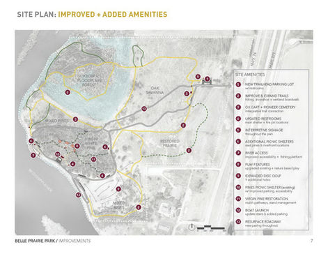 The 145-Acre Belle Prairie Park is uniquely situated at the confluence of expansive prairie, oak savanna, and the remnants of Minnesota’s towering white pine forest along the mighty Mississippi River. Expanding upon the original master plan, this Schematic Design effort developed recreational and ecological improvements across the site to yield a robust planning document to guide future funding and implementation efforts. With a focus on accessibility and ecological sensitivity, site improvements detail accessible trails expansions, additional picnic shelters and restrooms, parking improvements, a disc golf course and pine forest restoration. A new fishing platform, nature based play, and a wayfinding and signage package offers opportunities for visitors to connect to the biodiverse landscape and celebrate the rich cultural history of the site’s Frist People’s stories, logging legacy, Red River Ox Cart Trails within the park. Working closely with the client, the resulting design delivers features that are sustainable, engaging, and create a Belle Prairie Park that is poised to support future generation of park users.