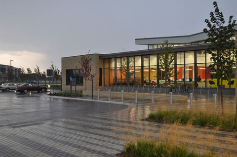 The Maple Grove Library is designed as a pavilion in a park. The design integrates outdoor views and spaces creating a strong inside-outside relationship and extending the experience beyond the walls of the library. A community porch on the backside of the library offers sweeping views of the lake and adjacent Town Green. The front entry offers a contemporary solution with decorative paver bands, linear massings of native and ornamental grasses, seating, bicycle parking and stainless steel bollards. An expansive green roof provides color and minimizes stormwater runoff while reducing the energy consumption of the building