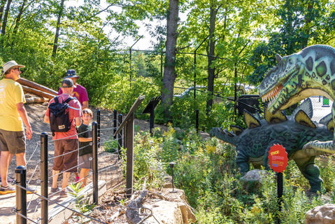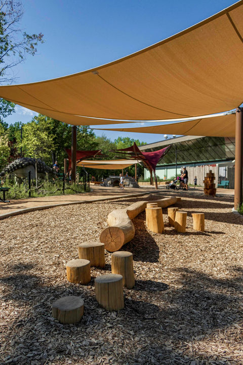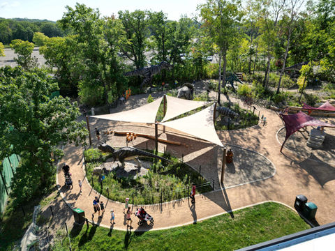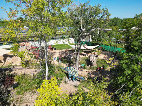 Damon Farber has a long-standing relationship with the Minnesota Zoological Gardens and a history of creating unique environments for zoo visitors. At the Dino Hideout, DF was contracted to lead a multidisciplinary team in creating a one-of-a-kind, nature-based play area that integrates life-sized animatronic dinosaurs. Our design approach was sensitive to the existing conditions of the site, with trails, dinos, and play features carefully integrated into the existing topography and around mature trees. In cases where trees couldn’t be preserved, the lumber was harvested and used in the construction of the site’s custom play features. When adventuring through the Hideout, you’ll find that the play features offer a diverse set of experiences that are age-appropriate, accessible, and shaded for those hot summer days. Dino Hideout opened to the public in the spring of 2023 and has been a successful draw for visitors to the Minnesota Zoo.