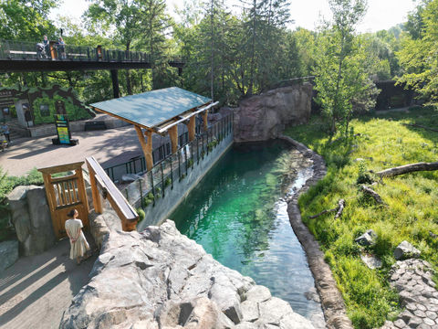 The twenty year old Tiger Lair Exhibit at the Minnesota Zoo needed guest safety and animal containment improvements and what it got was a ferocious facelift. One improvement included upgrading the themed rockwork containment that was built in the 70’s with new techniques. Another improvement was the added shade and weather canopy at the moat viewing area for guest viewers was designed with round timber wood members and gives a unique, natural looking structure. And for the tigers, a new 18 foot water fall where they can play, relax and cool down. Created improved guest safety, viewing and and ADA accessibility. Viewing area improvements included themed rockwork of hidden 40 foot tiger. Exhibit improvements provided enhanced habitat features and tiger enrichment