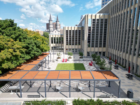 Damon Farber worked with the client’s architect to re-envision their under-utilized plaza deck space in the downtown St. Paul Minnesota headquarters building. The result is a welcoming, flexible space that strengthens a sense of entry to the building while also providing passive and active amenity space. Multi-colored and unit-sized paving areas with an artificial turf green divide the space into outdoor rooms, while a pergola provides a human-scale vertical backdrop at the plaza perimeter. Planters, site furniture, and lighting were carefully coordinated to tie-back to the plaza aesthetics and create optimal use with minimal maintenance. Four season interest is reflected in the planting palette to help users enjoy this spot of nature year-round.